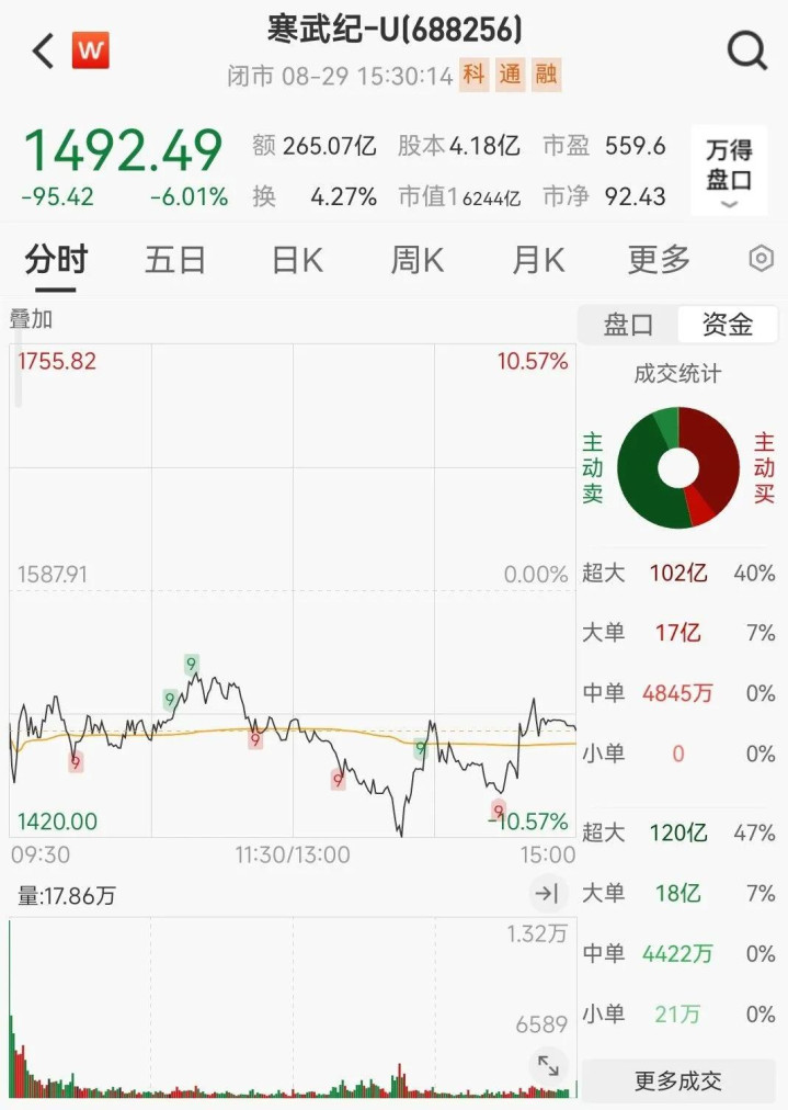 寒武纪早盘低开6.8%,午后跌幅一度扩大至10%,截至收盘股价下跌6.01%,报1492.49元/股,总市值为6244亿元,成交额达265.07亿元。