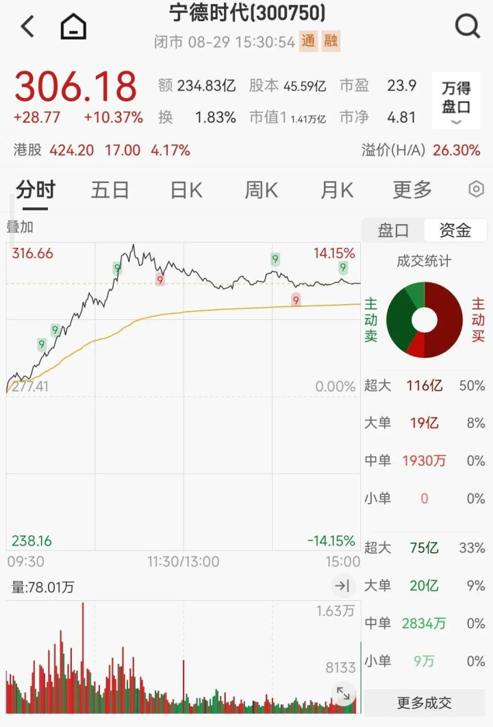 锂电产业链今天全面爆发,先导智能、杭可科技20%涨停,天孚通信、国轩高科、璞泰来涨停。宁德时代涨超10%,股价重回300元上方,创近三年新高。在龙头带动下,创业板一度突破2900点。