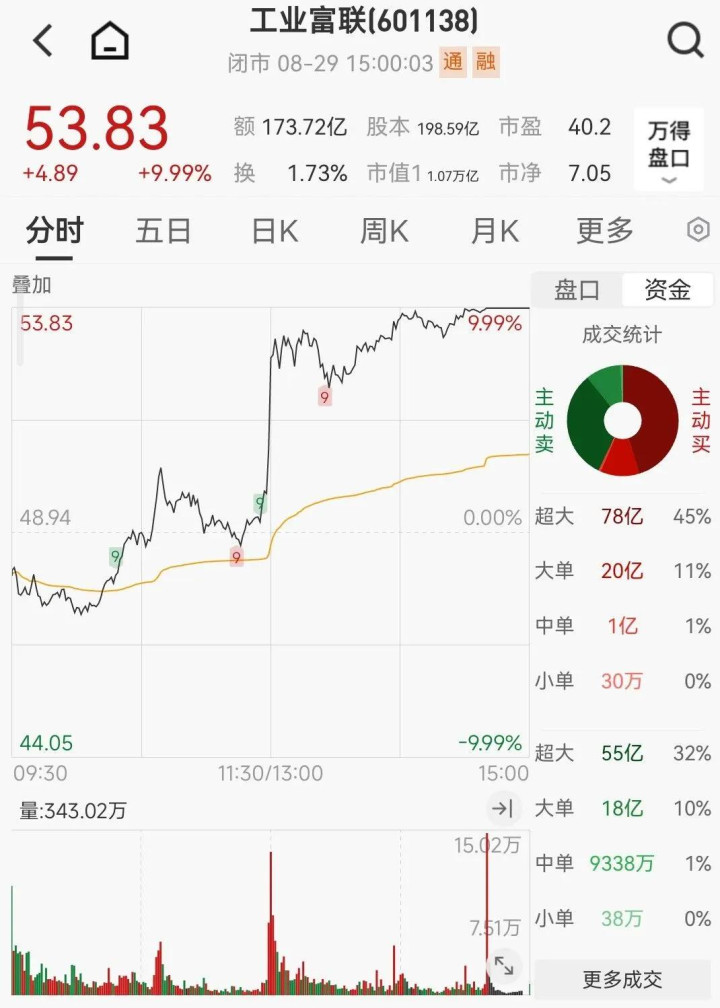 午后,工业富联继续震荡上行,尾盘强势涨停,总市值超越中国人寿,跻身A股市值榜前十名。截至收盘报53.83元/股,总市值1.07万亿,成交额173.72亿元。